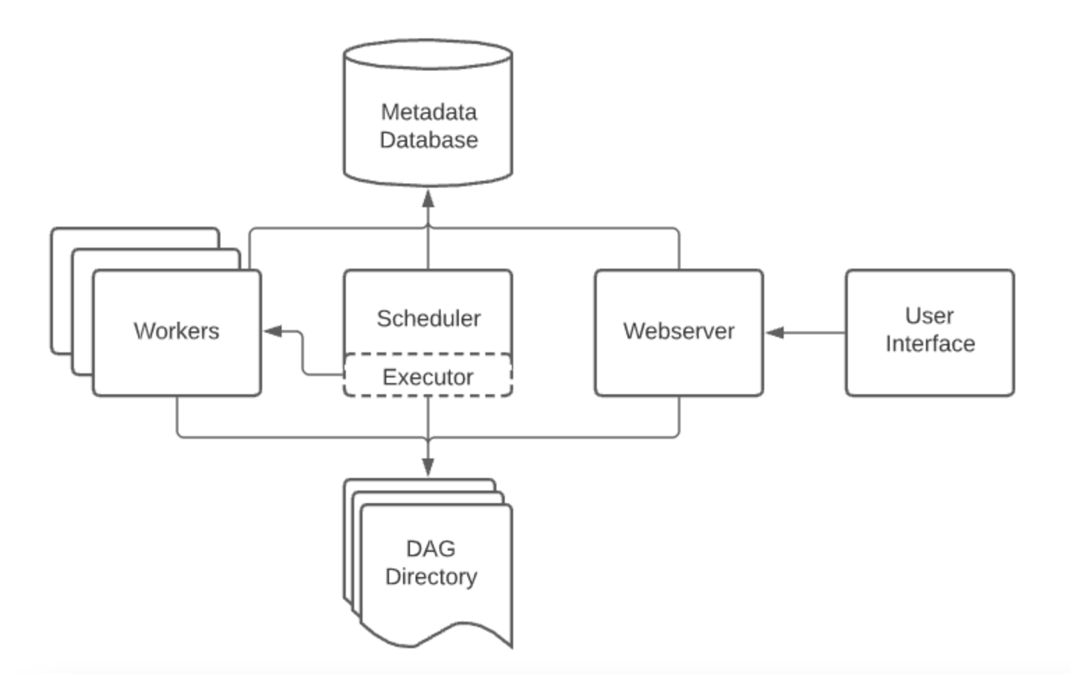 에어플로우의 개괄적인 개념도 입니다. Scheduler는 에어플로우에서 가장 핵심적인 컴포넌트인데요. 예정된 workflow를 triggering 하기도 하고, executor가 다음 task를 실행할 수 있게 제출하기도 합니다. 이름 그대로 각 task들의 스케줄을 관리하는 매니저 역할이라고 보면 됩니다. 스케줄러와 붙어있는 Executor는 지금 running 중인 task를 핸들링합니다. 또한 어떤 환경에서 task가 실행될지에 대한 타입을 정의하는 역할을 합니다. 어떻게 task가 실행될지에 대한 정의를 하는 것이죠. Worker는 말 그대로 실제 수행을 하는 컴포넌트 입니다. Scheduler, Executor, Worker외에 Webserver와 Database가 있는데요. database에는 task, dag 등의 메타데이터 정보를 보관하는 곳입니다. webserver는 사용자가 dag의 상태나 로그, 그래프 등을 확인할 수 있는 UI를 제공합니다. 그렇다면 DAG는 무엇일까요? dag는 directed acyclic graph를 말합니다. 단방향 비순환 그래프를 뜻하지요. task가 한 방향으로 흐르고 순환하지 않는다는 (되돌아가지 않는) 뜻입니다. 한 dag안에 각각의 task에 실행 순서를 정해주면 됩니다. 위에서 말한 데이터를 로드하는 스케줄을 예로 들면, 경쟁사 데이터를 받아오고 파이썬 판다스 등의 라이브러리로 데이터를 컨버팅 하고 회사 디비에 로드하는 것을 각각의 task라고 할 수 있습니다. 그리고 이 task들에게 순서를 부여하여 묶어서 실행 시간을 정해주면(예: 매일 오후 3시) 그것이 하나의 dag가 되는 것이죠!